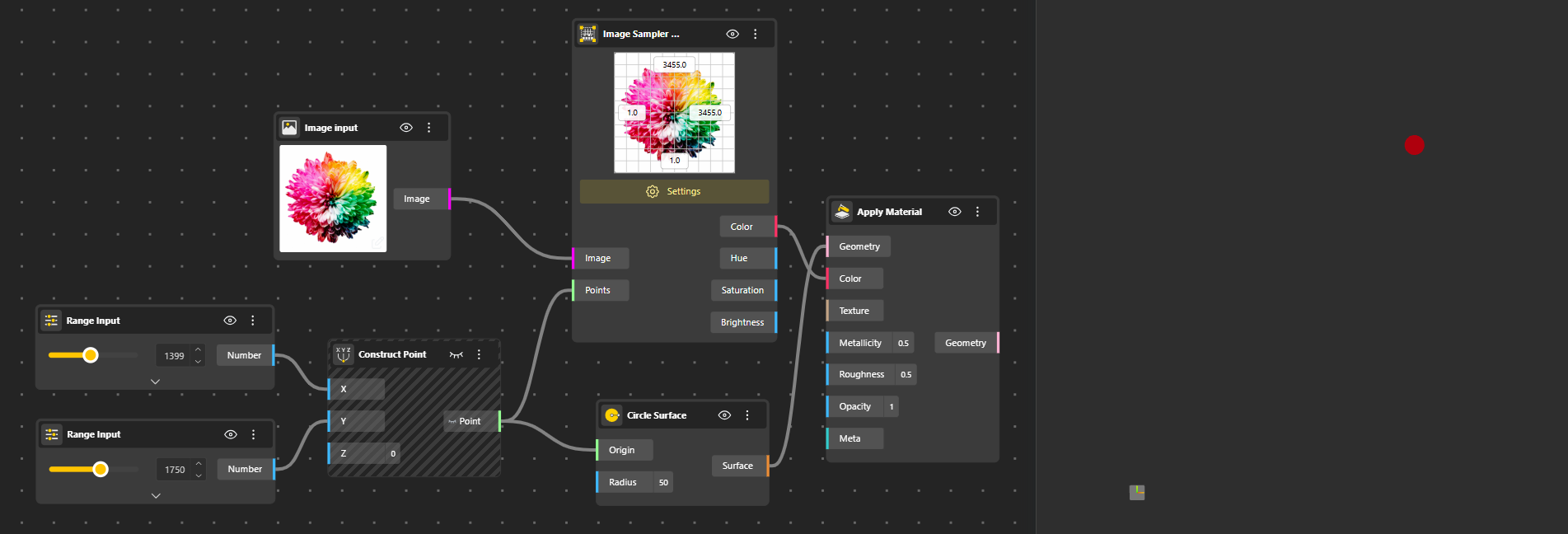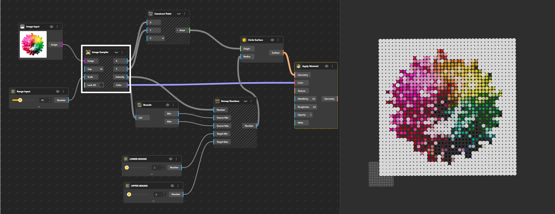 The Image Sampler reads an image and extracts data from it at regular intervals. It samples pixel positions and retrieves information such as color values and intensity. This data can then be used to drive geometry, patterns, or logic based on the image content. It is commonly used when you want image pixels to control parametric designs.