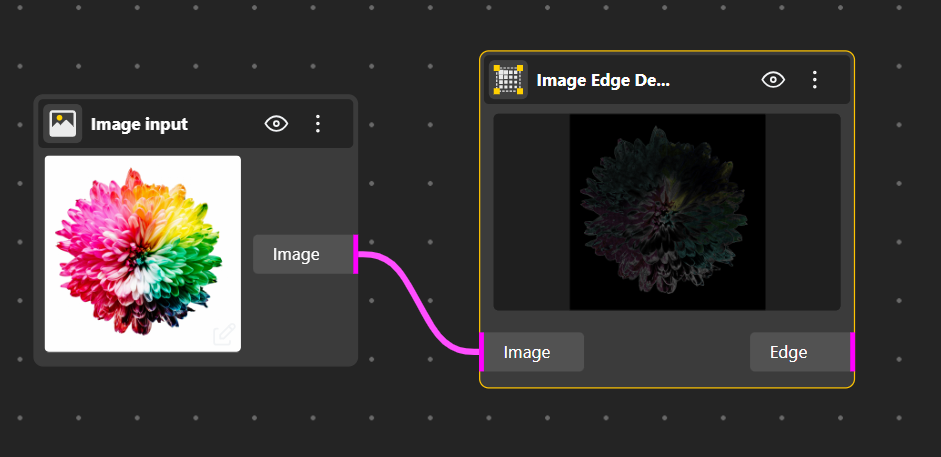 The Image Edge Detection node identifies edges, outlines, and boundaries by detecting contrast transitions. This is useful for extracting shapes, contours, or structural patterns from images. Often used in image-to-geometry or analytical workflows.