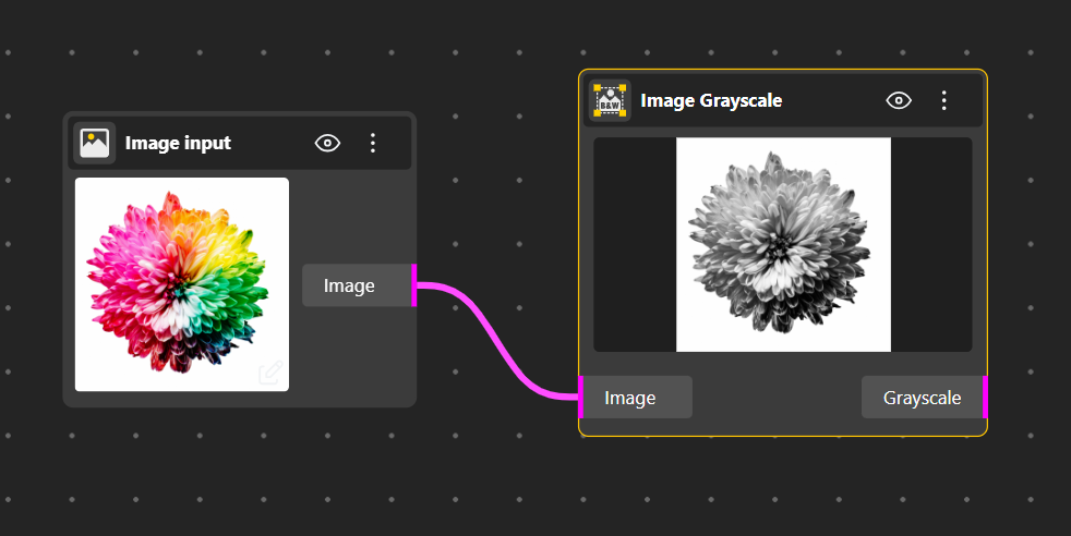 The Image Grayscale node converts a color image into a grayscale image. All color information is reduced to brightness values, simplifying the image data. This is often used before analysis tasks like edge detection or intensity-based sampling. It helps focus only on light–dark variations rather than color.