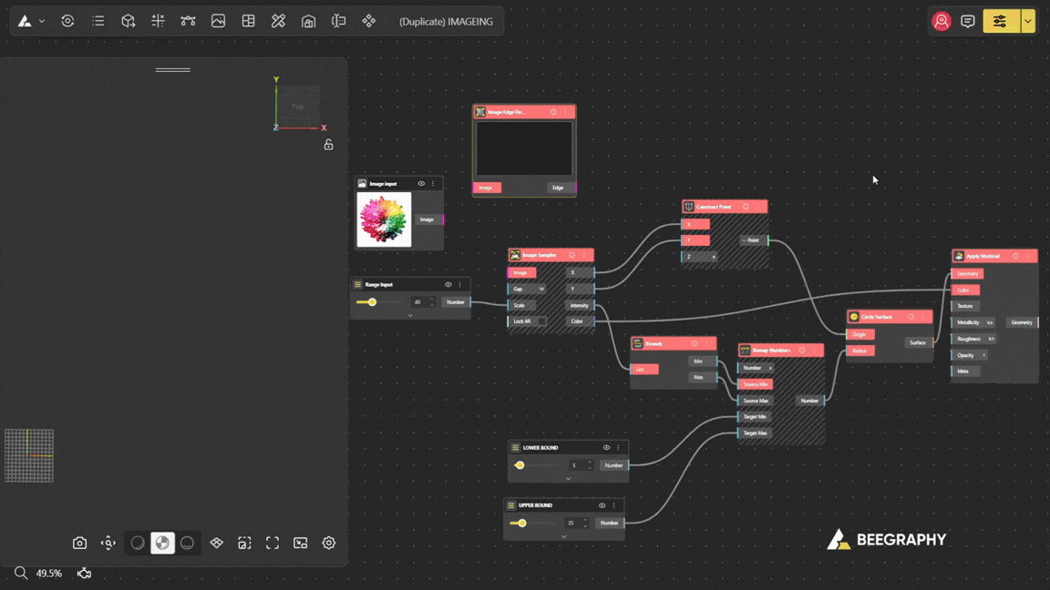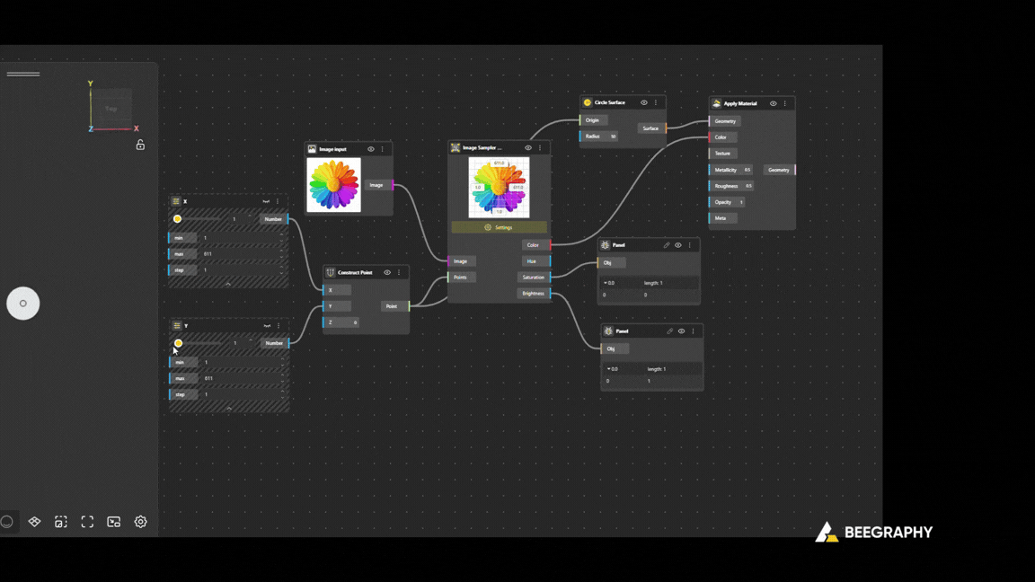 The Imaging Plugin in BeeGraphy allows you to work with images as data, not just visuals. Instead of treating images as static pictures, this plugin lets you extract information from images such as color, brightness, position, and edges and use that information to drive geometry, patterns, and logic in your node graph.