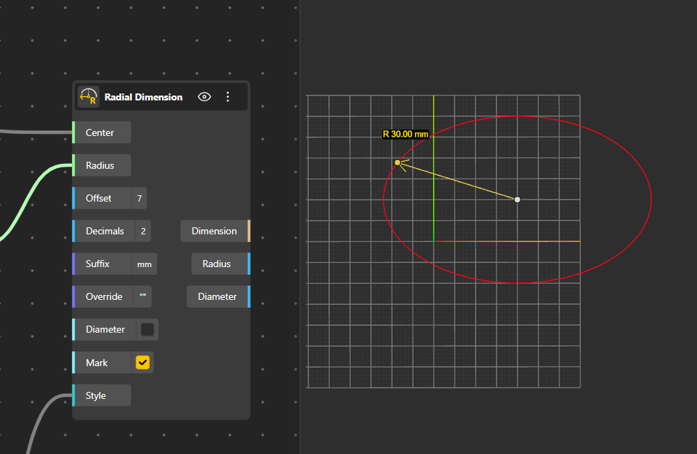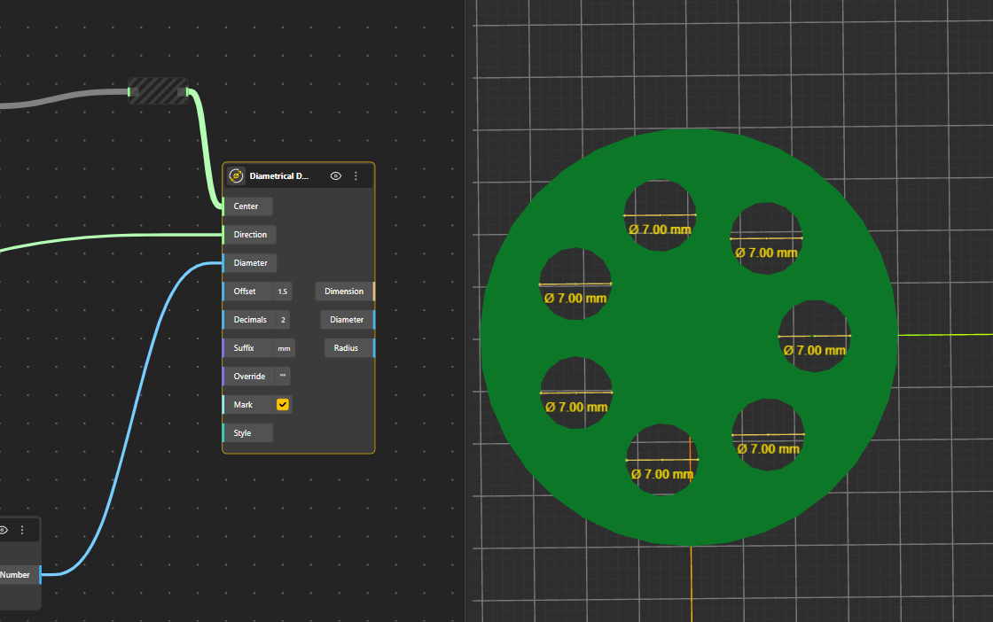The Diametrical Dimension node directly visualizes a diameter using a given direction from the center point. It draws a diameter line across the circle, optionally includes arrowheads, and can display a center mark. This node is useful when a diameter value is already known or controlled parametrically, while still needing to be clearly annotated in the viewport. Both diameter and radius values are made available as outputs.