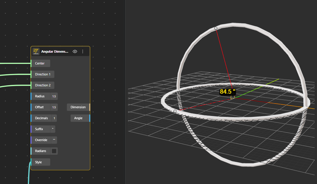 The Angular Dimension node visualizes the angle formed by two directions around a center point. It draws an arc between the directions, adds arrowheads at the arc ends, and places a text label showing the measured angle. The radius of the arc, label offset, unit format (degrees or radians), precision, and labeling can all be customized, making it suitable for clearly communicating rotational relationships in both conceptual and technical models.