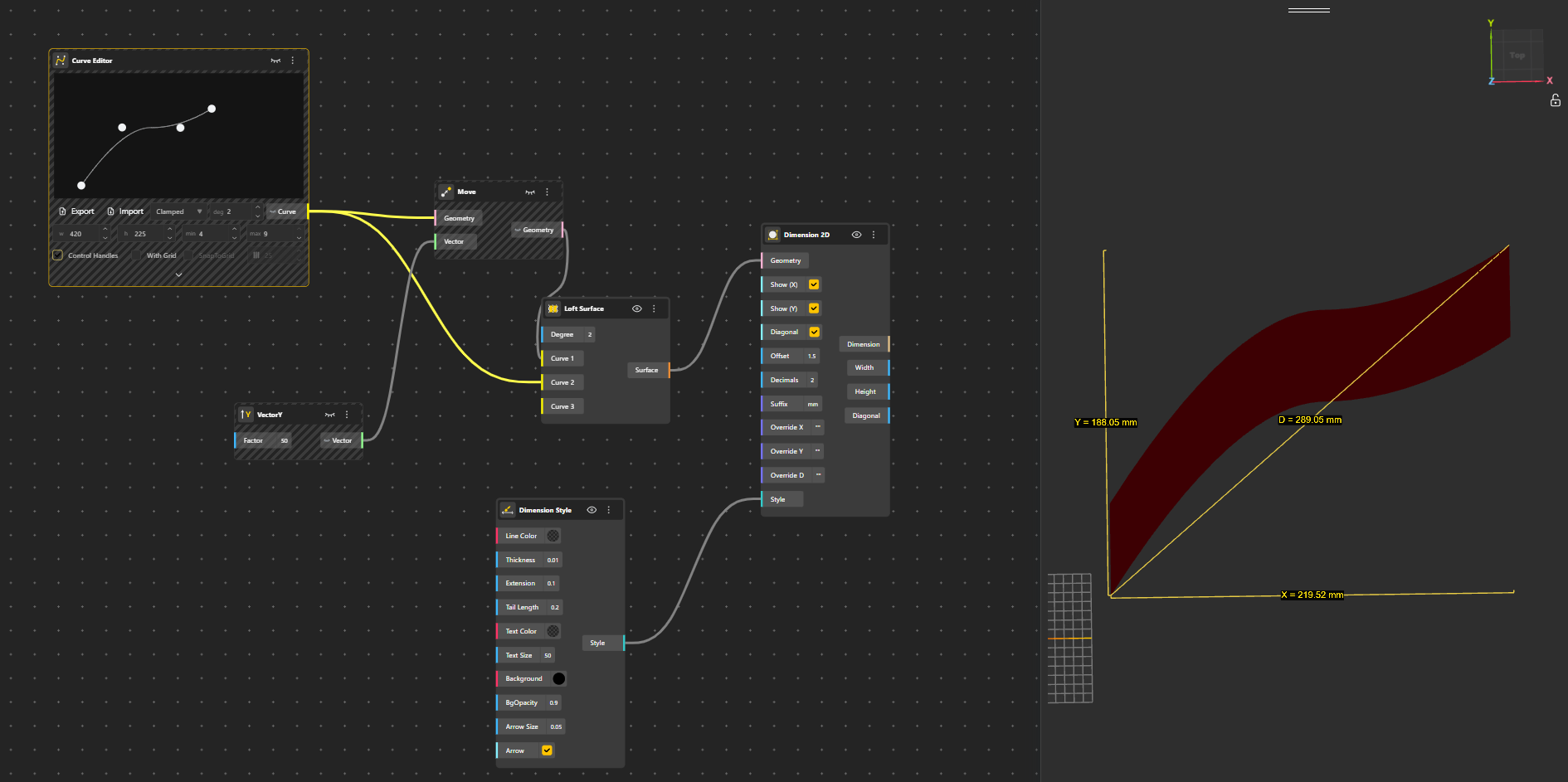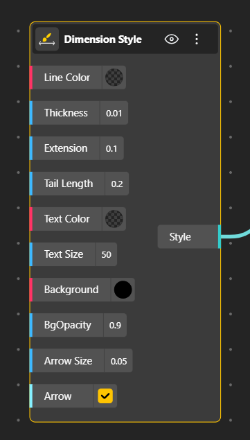 To control the appearance of all dimension graphics, the Dimension Style node generates a reusable style object. This node allows users to define line color and thickness, extension line length, arrow size, arrow tail length, text size, text color, and text background settings. By connecting the style output to one or more dimension nodes, a consistent visual language can be maintained across an entire model.