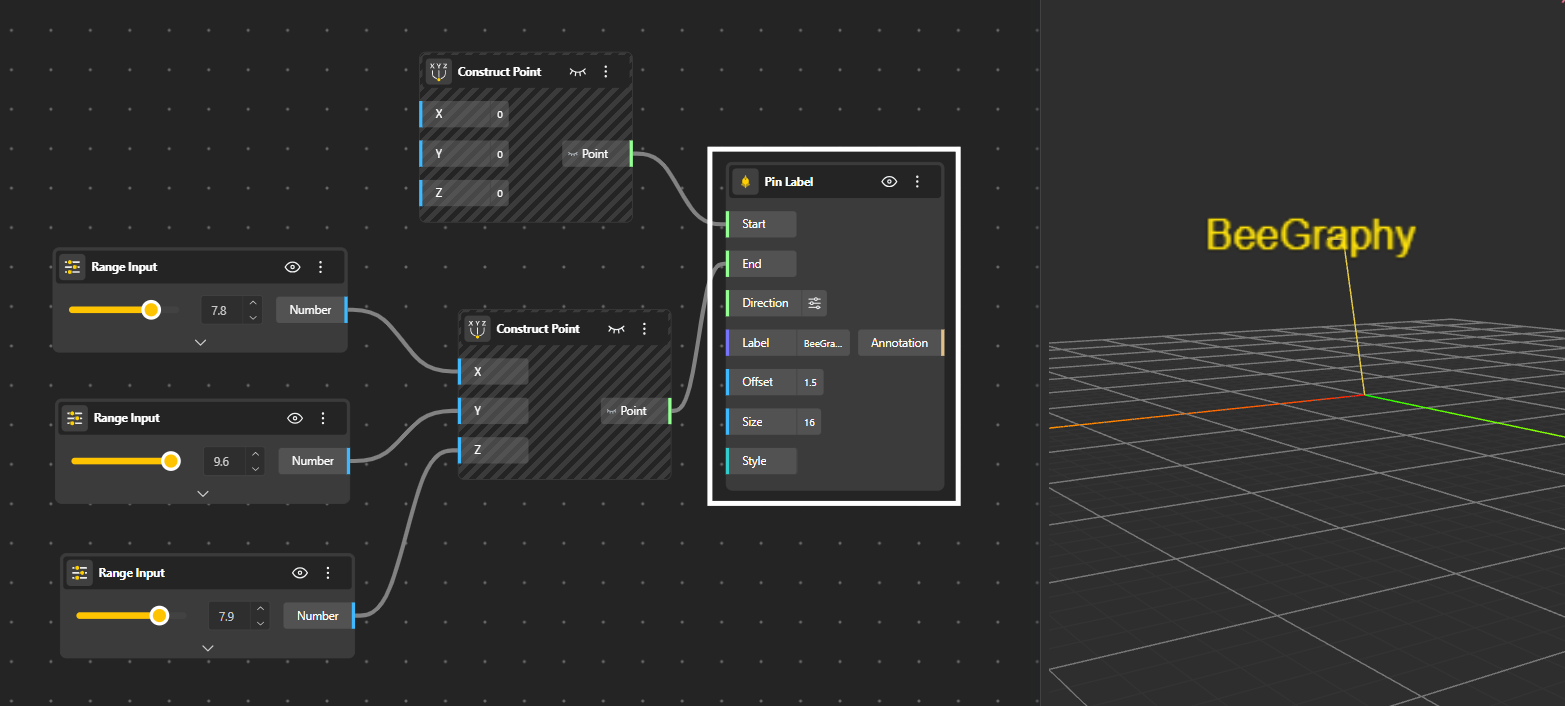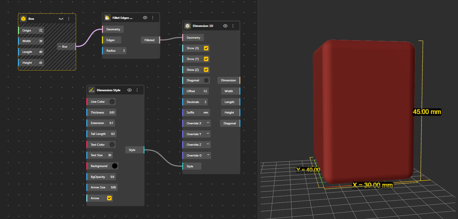 The Dimension 3D node extends this concept to three dimensions, calculating the bounding box of geometry in space and displaying width, length, and height, with the option to show the diagonal as well. Like its 2D counterpart, it outputs all measured values numerically while rendering clean dimension graphics in the viewport, making it suitable for volumetric checks and spatial validation.
