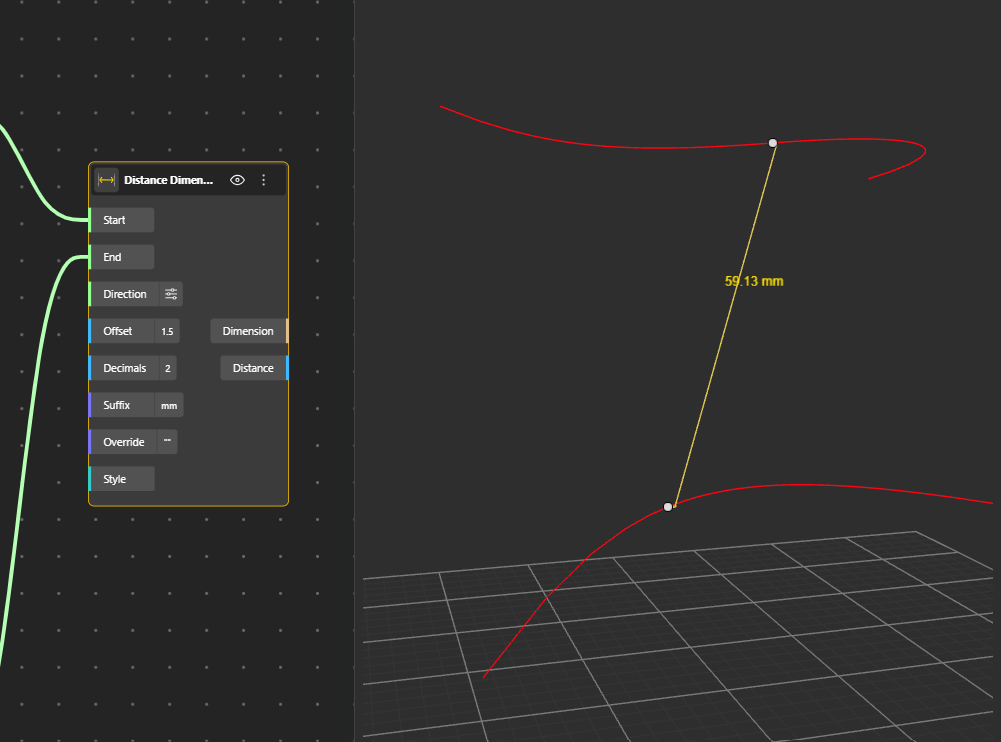 The Distance Dimension node measures the straight-line distance between two 3D points and renders a line with optional arrowheads with numeric distance value labelled. Users can control the offset of the label, the number of decimal places shown, and the unit suffix. If no direction is provided, the node automatically computes a perpendicular direction to place the dimension clearly in space.