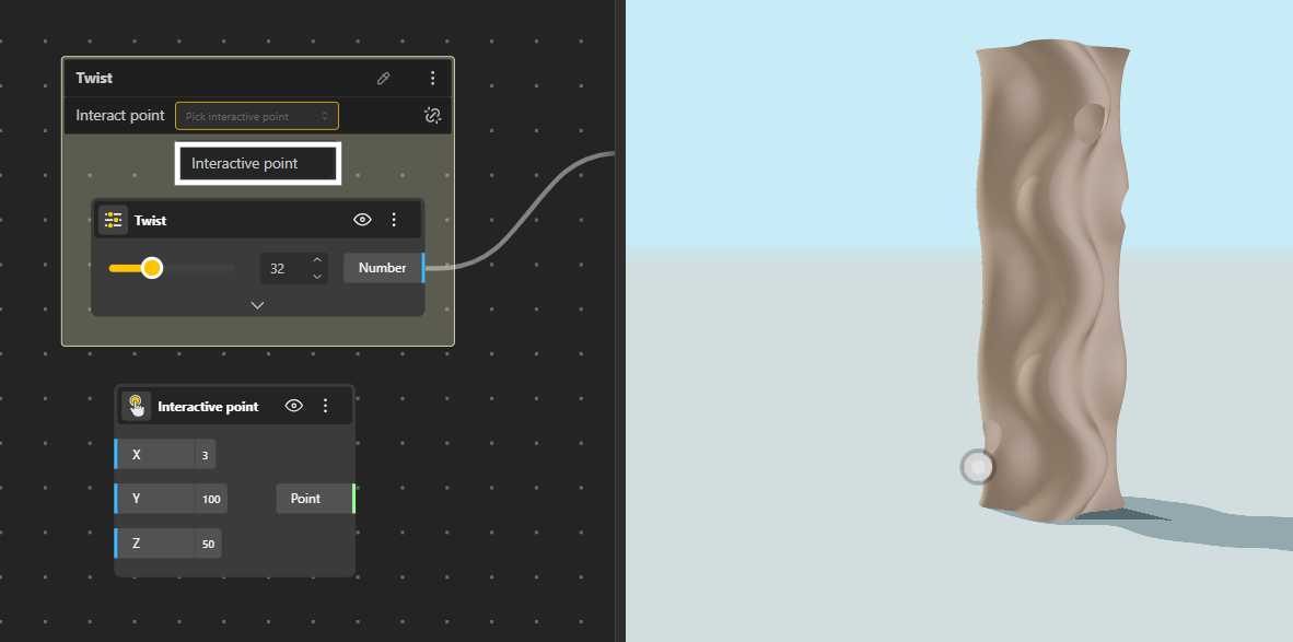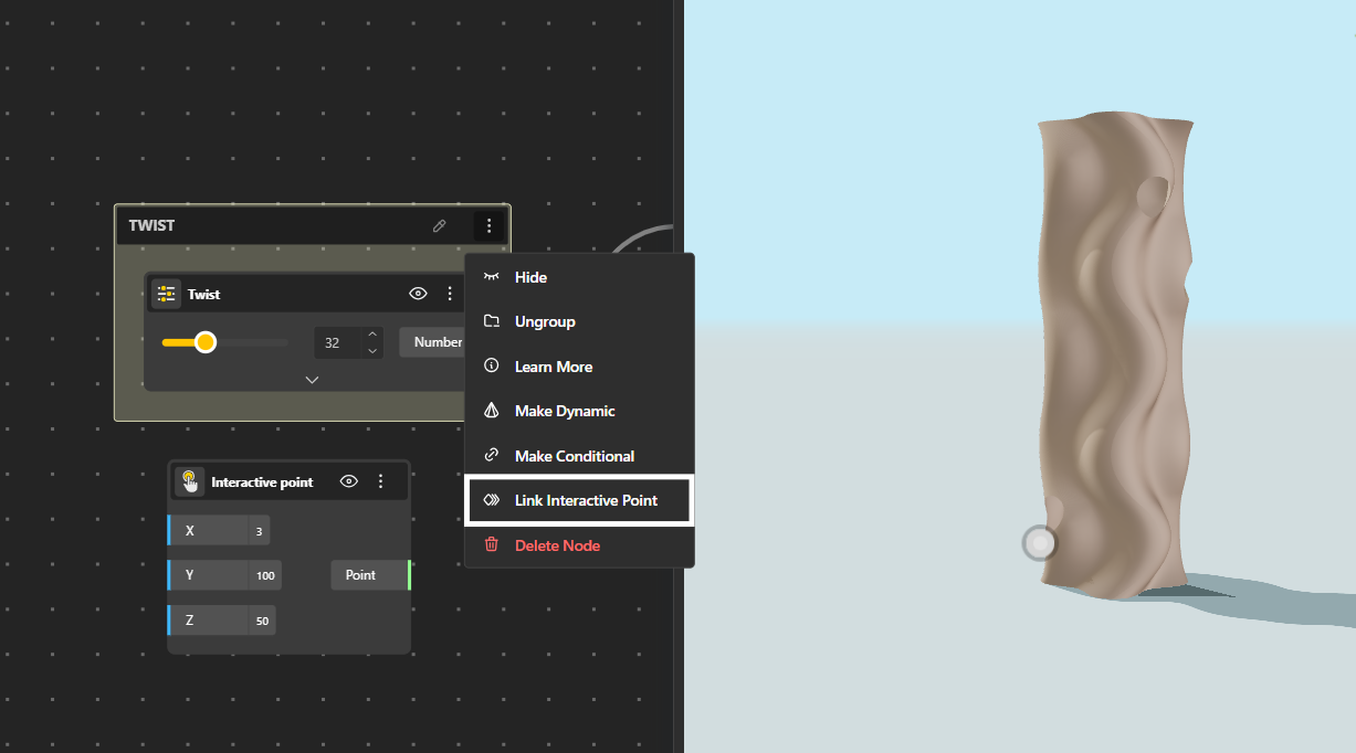 An Interactive Point is a visual control anchor placed directly within your 3D model’s viewport that lets designers and viewers interact with specific aspects of a model by clicking.