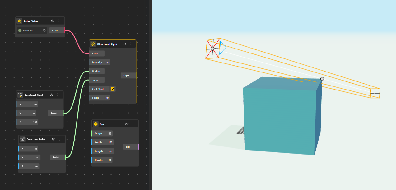 Directional Light simulates light coming from an infinite distance with parallel rays, similar to sunlight. The light direction is controlled using position and target inputs, and it can cast strong, well-defined shadows across geometry.