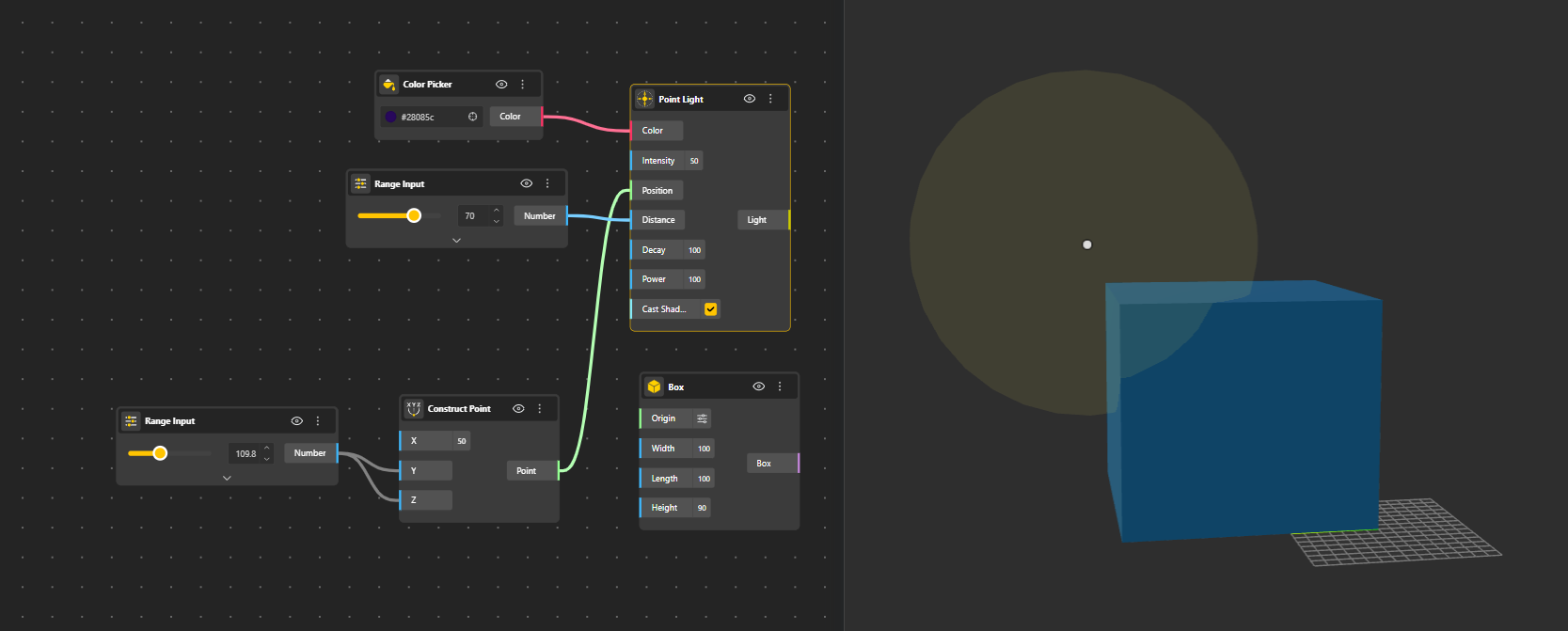 Decay: Controls how light intensity decreases over distance from the source. Higher decay values cause light to fall off more quickly, creating more realistic and localized lighting effects.