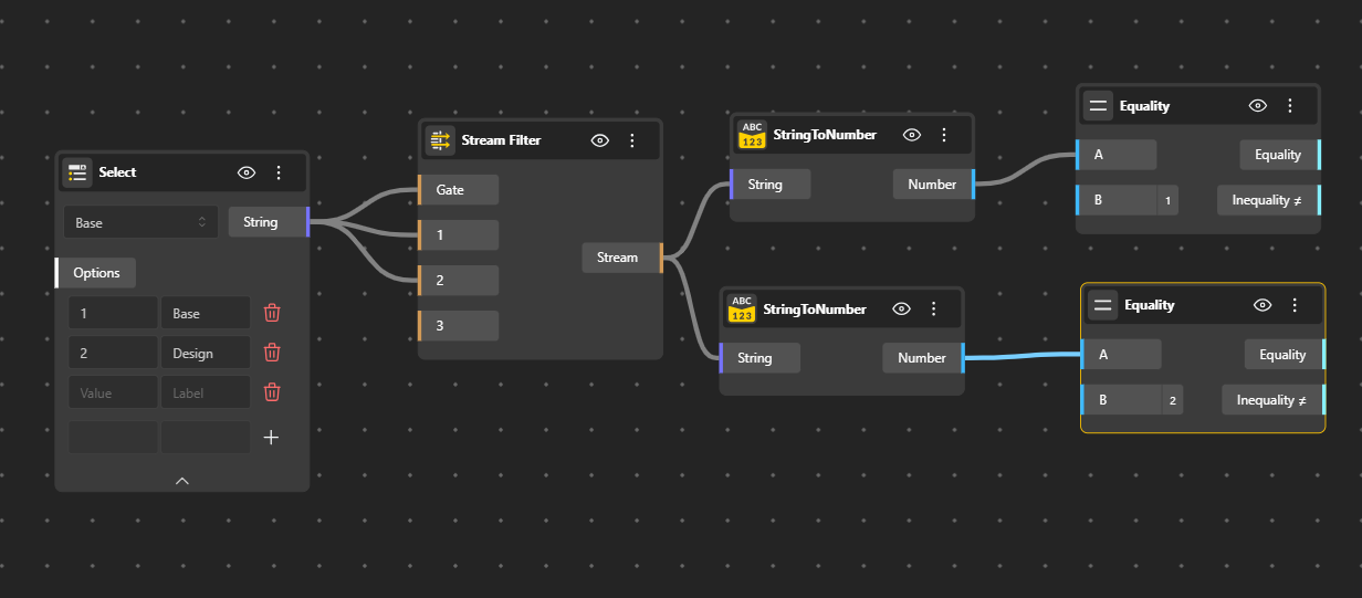 Connect the output of StringtoNumber to the first input (A) of all Equality nodes.