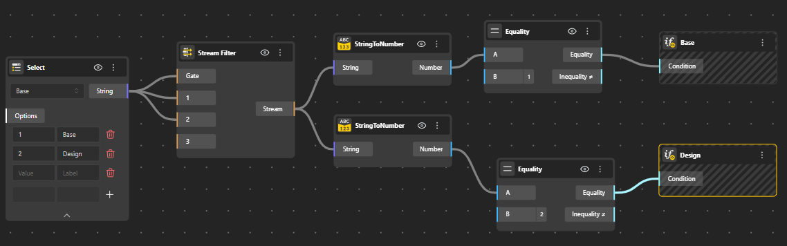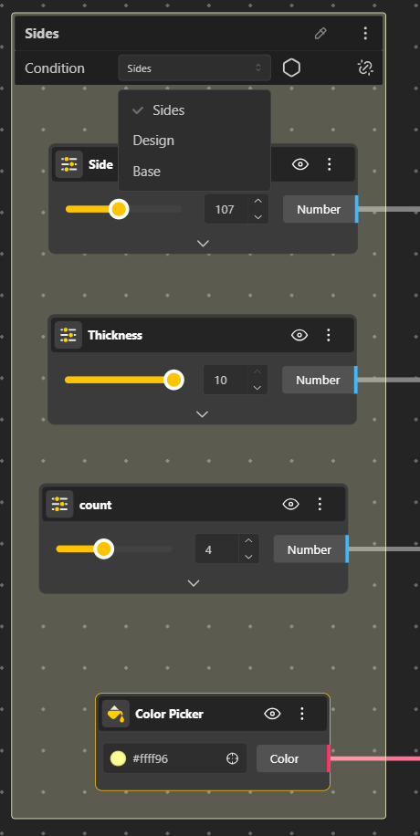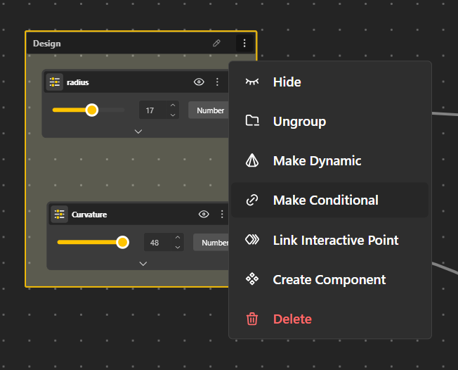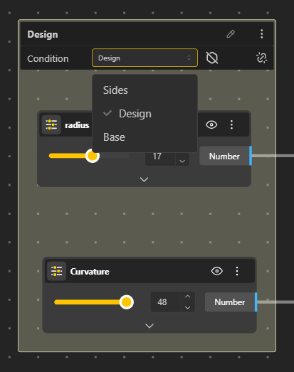 Conditional Group helps structure complex parametric definitions in BeeGraphy by allowing geometry and parameters to be organized into clear, selectable sections. When a Conditional Group is used, only the parameters related to the currently active condition are shown and evaluated in the Demo and Configurator, while all others remain hidden.