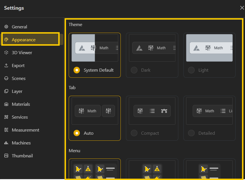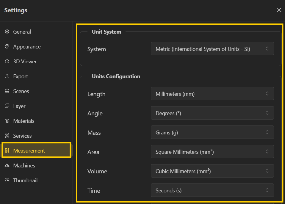 Whether you're optimizing performance, adjusting visual preferences, or managing outputs like materials, scenes, and machines, the Settings panel gives you quick access to everything in one place.