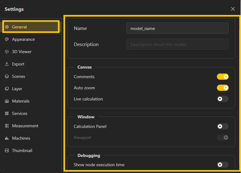 The Settings panel in the Editor lets you control how your environment behaves, looks, and performs. It centralizes all configuration options—from basic model details to advanced debugging tools—so you can tailor the workspace to your needs.