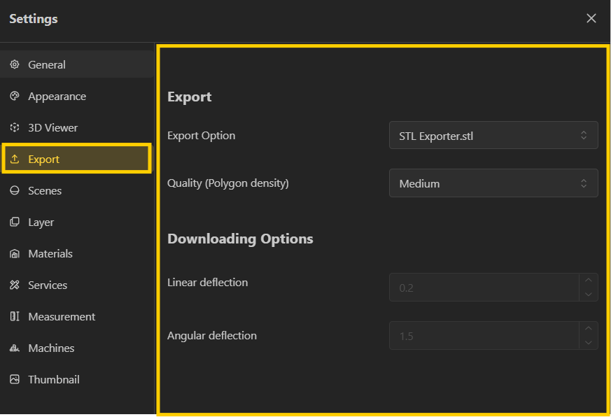 The Export Settings panel lets you control how your model is converted into downloadable files. You can export in multiple formats and adjust quality based on your use case, whether it's for visualization, sharing, or manufacturing.
