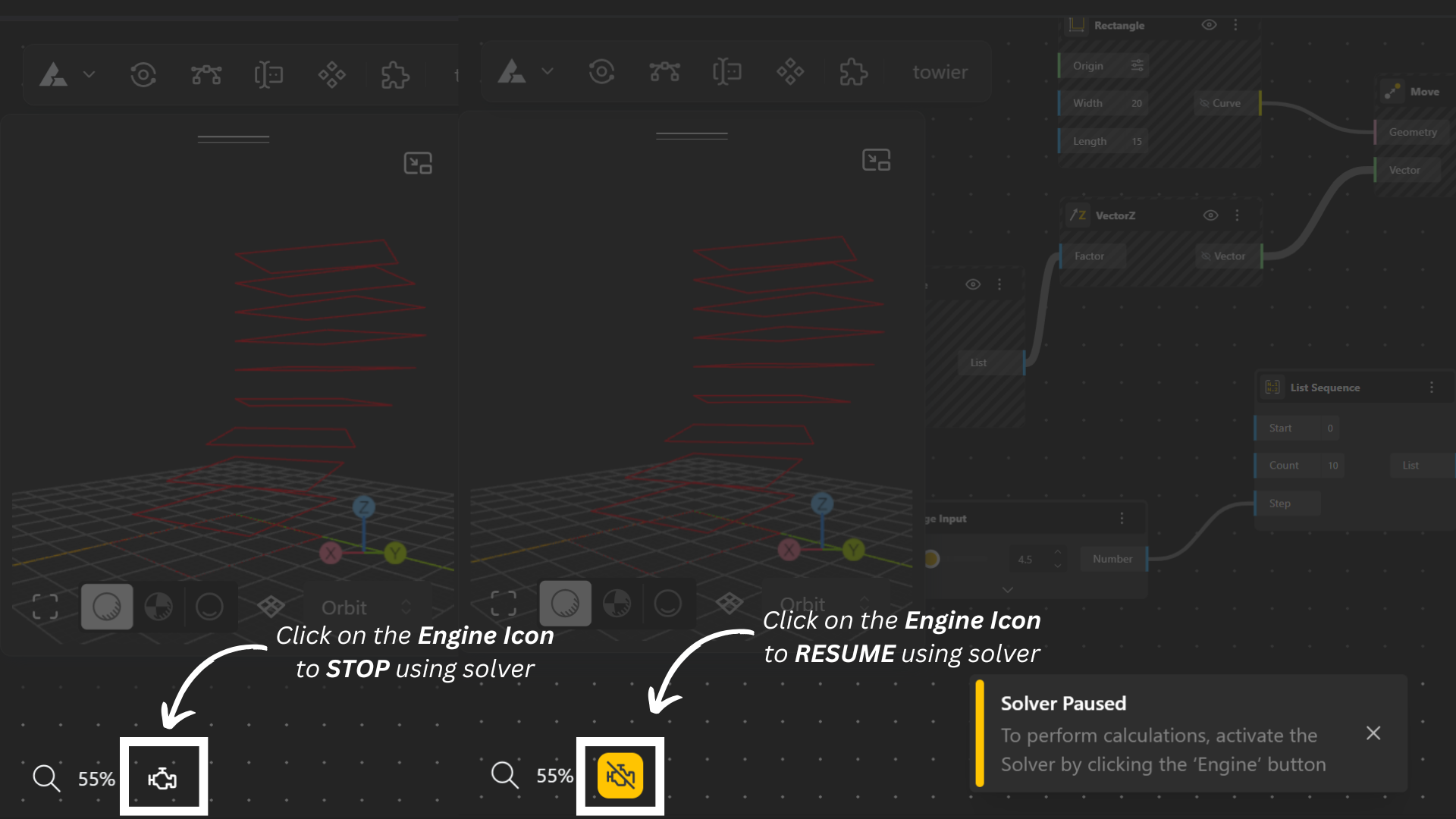 The Solver feature in BeeGraphy allows users to manually pause or halt the solving process of a model. When working on complex parametric designs, the solver continuously updates outputs in response to parameter changes. However, this can sometimes lead to heavy computation or performance lag when multiple updates occur rapidly.