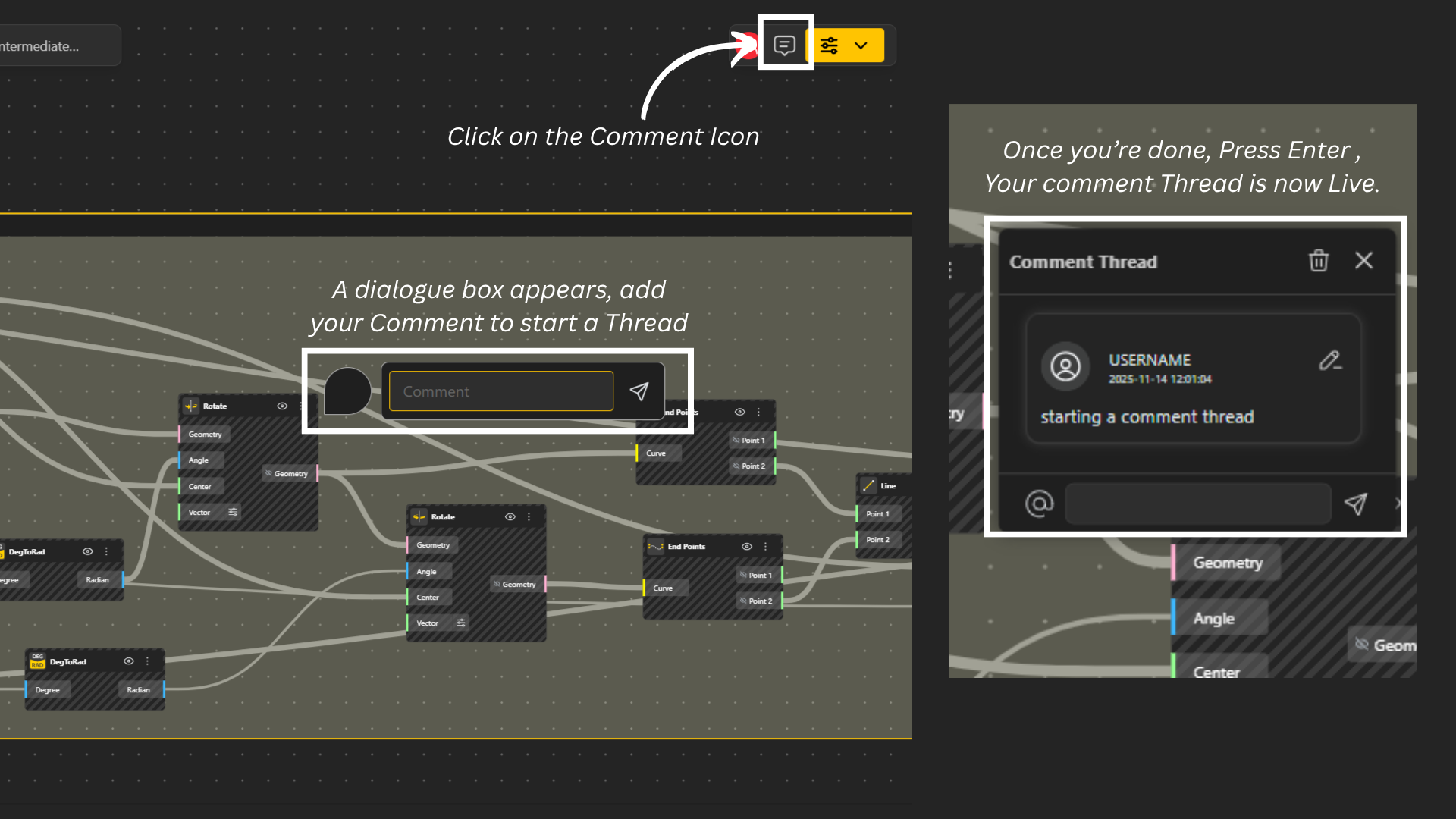 A comment thread is a conversation attached to a specific part of your model, allowing you and your teammates to discuss ideas, share feedback, and resolve issues directly within the Beegraphy editor.
