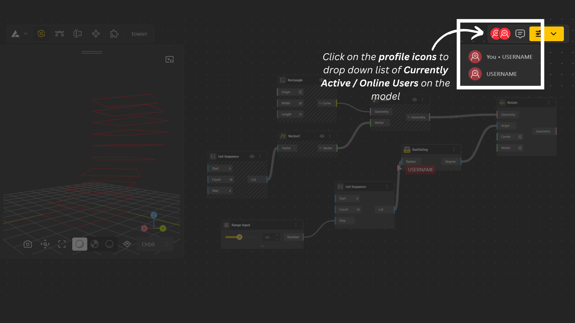 Click on the profile icon in the top-right corner to see the active or online users currently viewing your model.