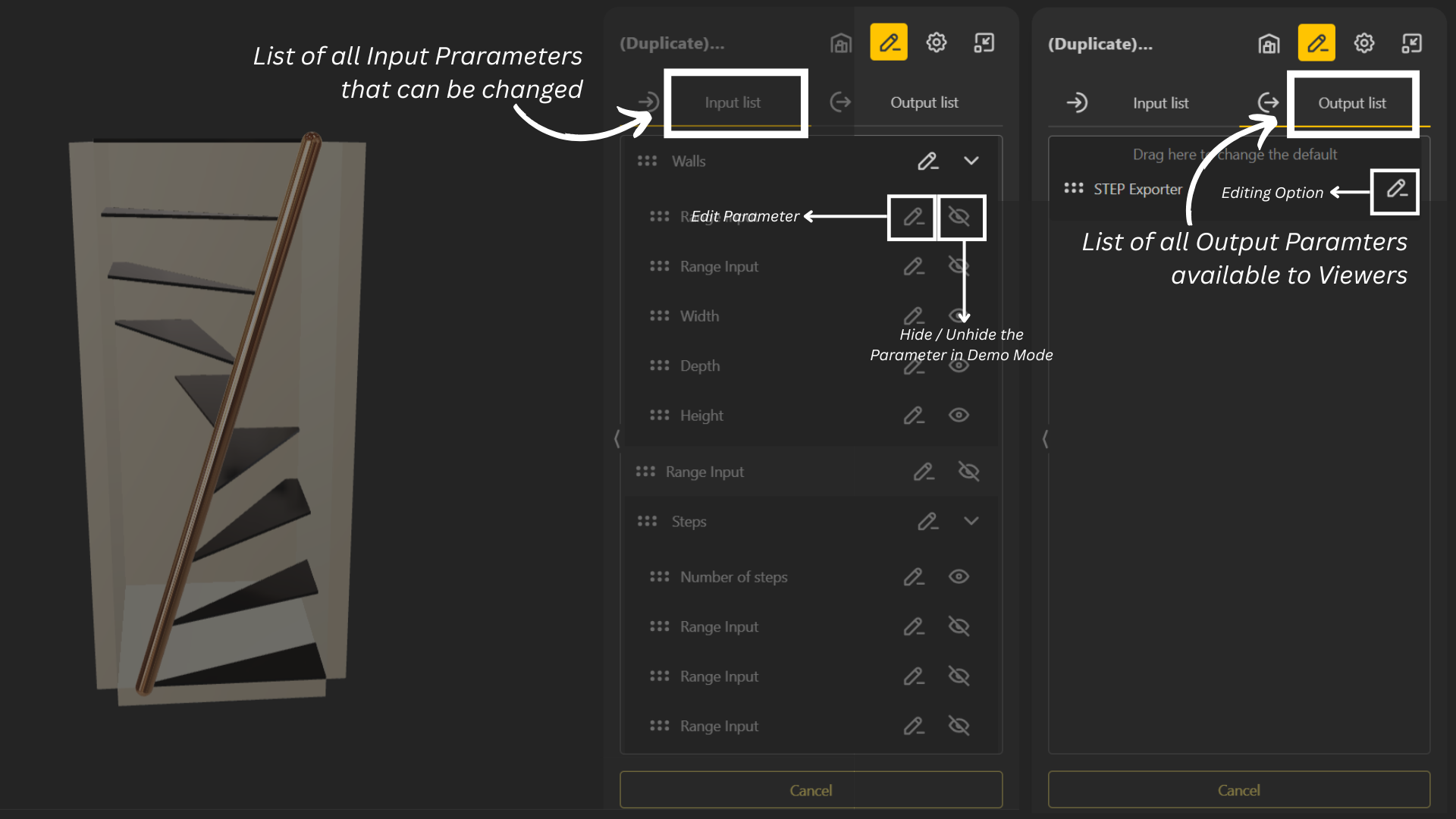 The Configurator Mode that lets you view and manage all parameters of your model. It allows you to define inputs and outputs, adjust values in real time, and control what elements are visible in the demo version. With the Configurator, you can fine-tune your model’s behavior while customizing how it’s presented to others.