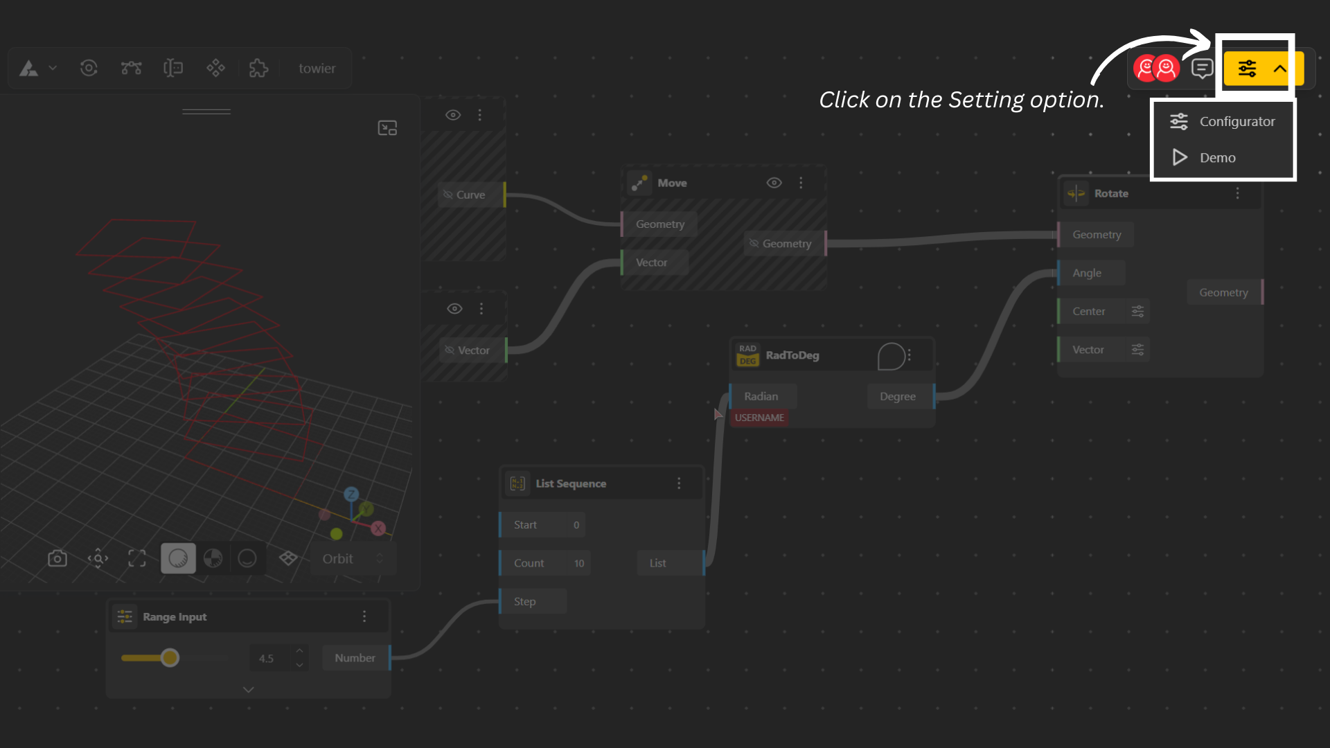 To open Configurator or Demo Mode, click on the rightmost settings icon and select your preferred mode from the dropdown menu.