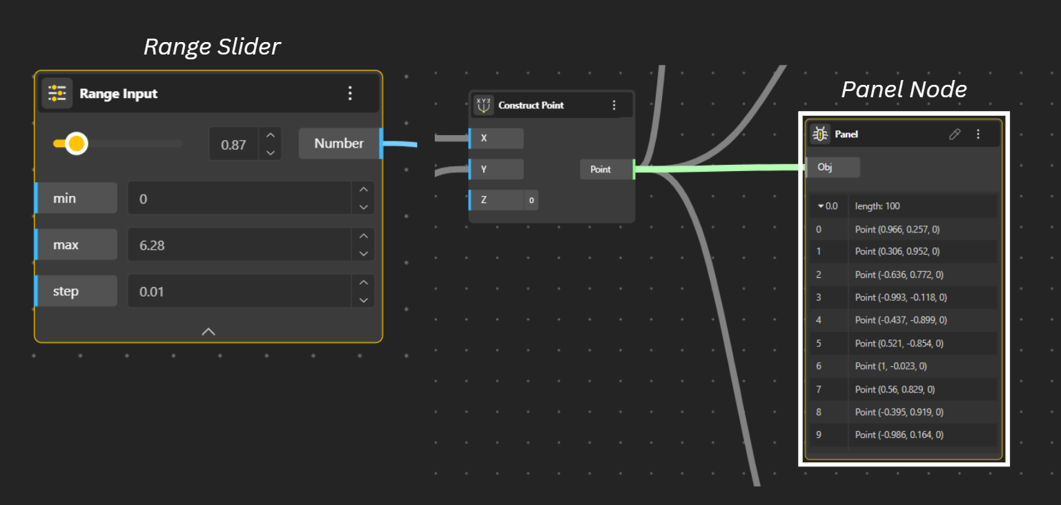 To Perform operations - Each node has a specific function, like a mathematical operation or a geometry-generating command. For example, a "Construct Point" node uses input data (X, Y, Z coordinates) to create a point.