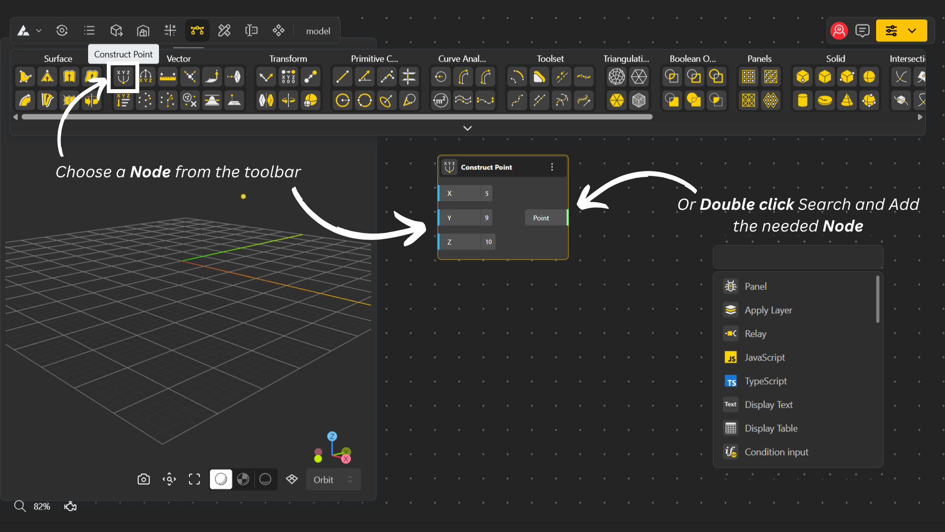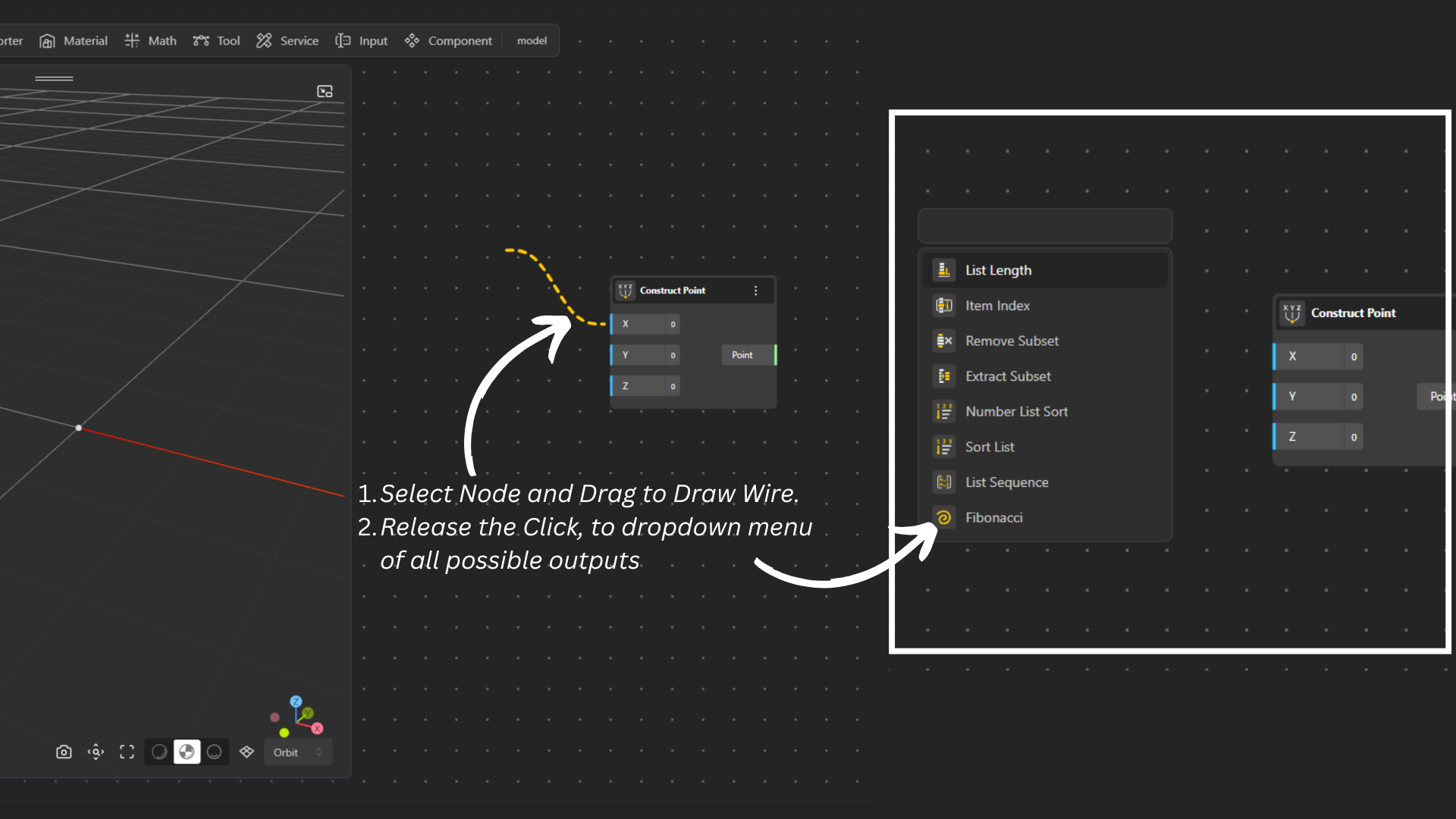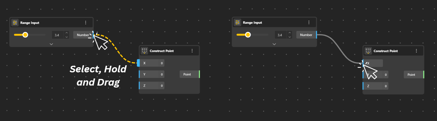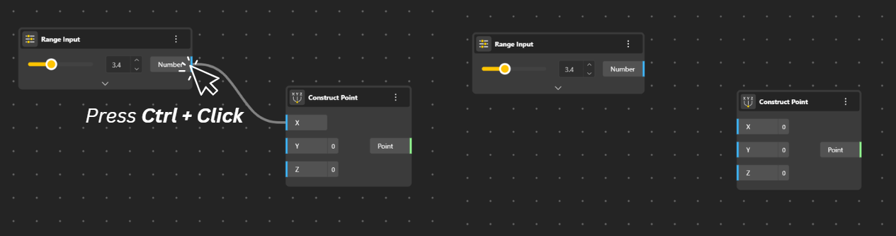 Example: To add a value into a point, drag a wire from the Range (output) and connect it to the Construct Point (input) or vice-versa.