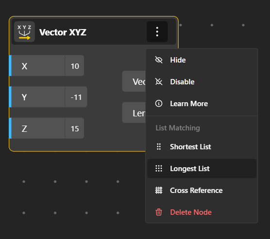Shortest List: When connecting lists, this option forces the node to process only up to the shortest list length.