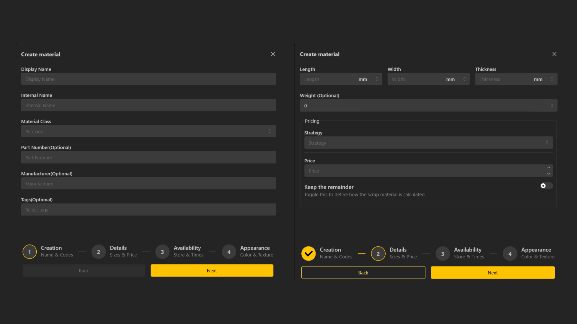 Pricing: Set the base price or variable pricing depending on the material or configuration.