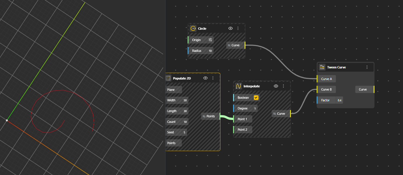 Factor: Determines the position of the new curve between the two input curves, where 0 aligns it with the first curve, 1 aligns it with the second, and values in between blend proportionally. (Range is between 0 and 1)