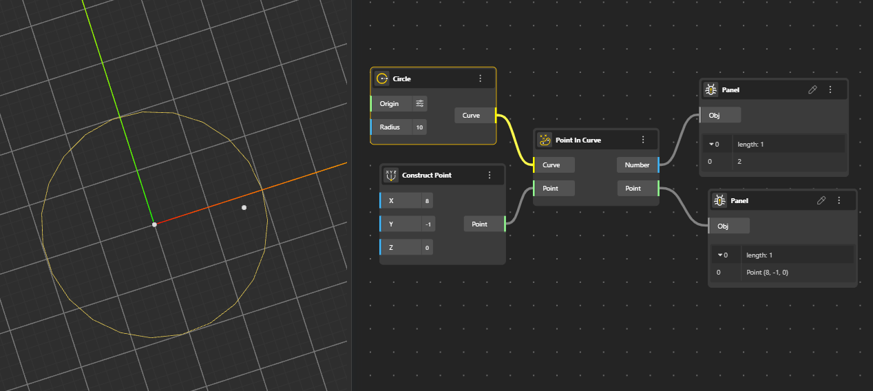 The Evaluate Curve node allows you to extract detailed geometric information from any point along a curve. You can evaluate the curve either by its parameter value (typically between 0 and 1) or by a specific curve length.
