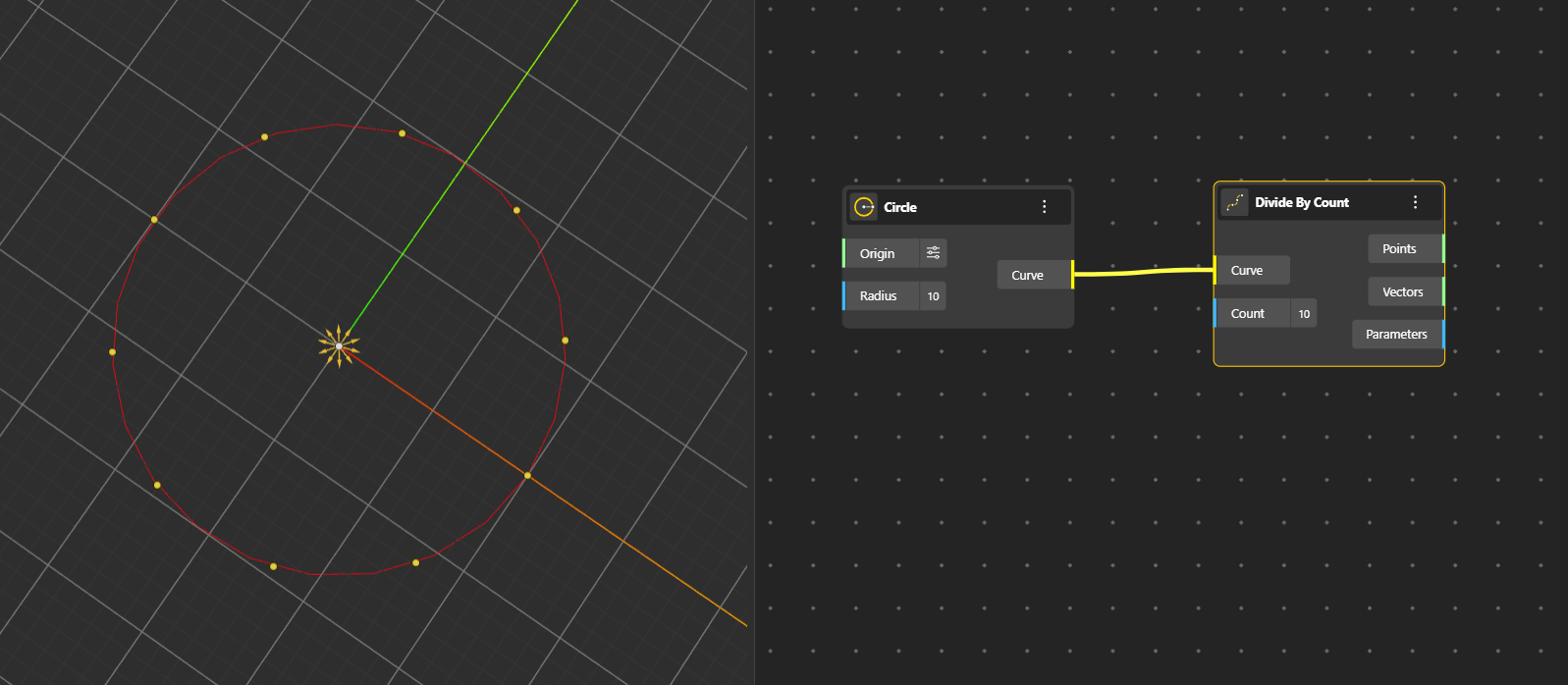 It places evenly spaced points along a curve based on the number of divisions you specify. The output ports give you: