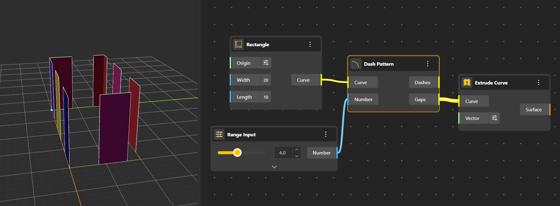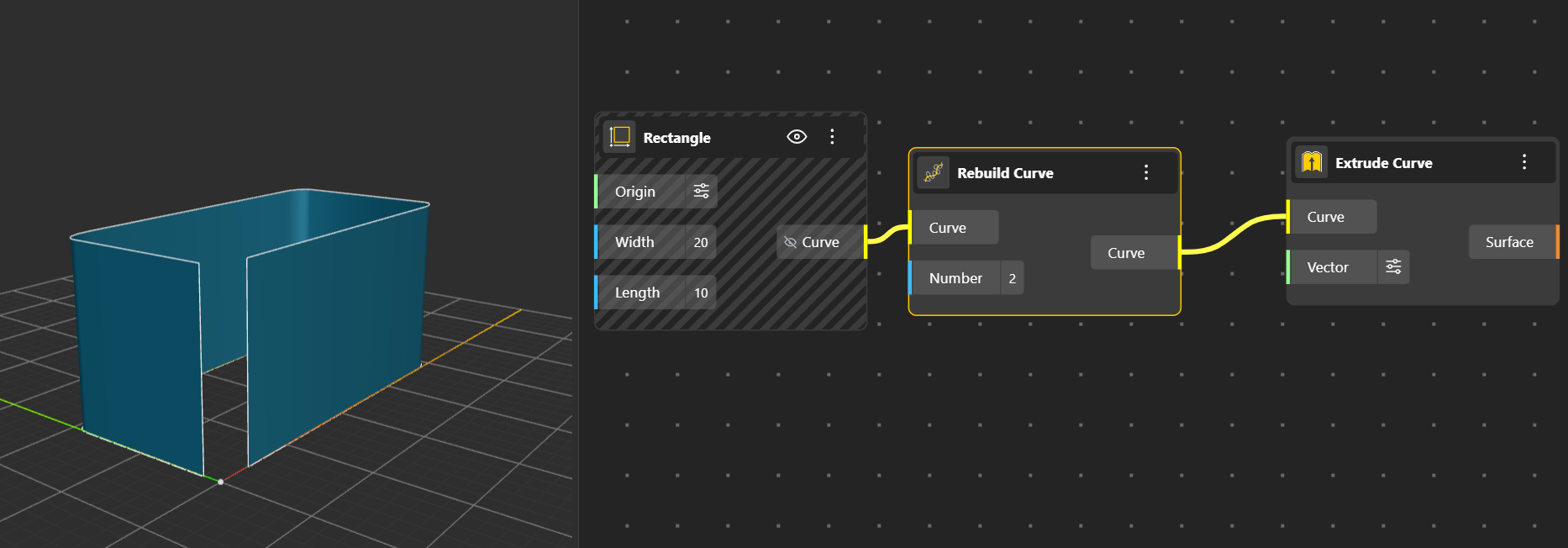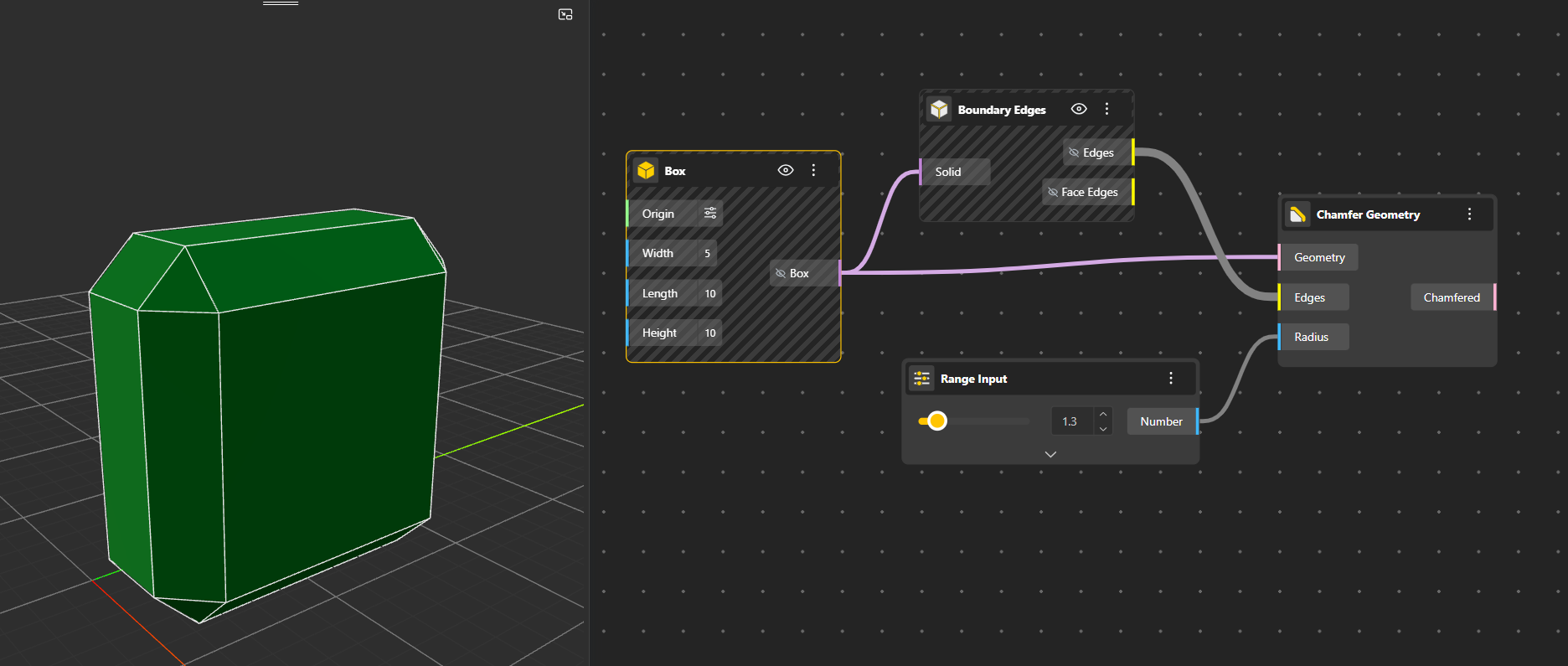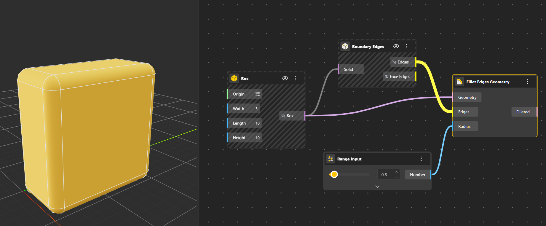 Fillet Geometry Creates a rounded, smooth transition between two edges or curves. Radius input port allows you to define the radius of the Fillet.To clearly see the final result, hide the original geometry so only the filleted output is visible.