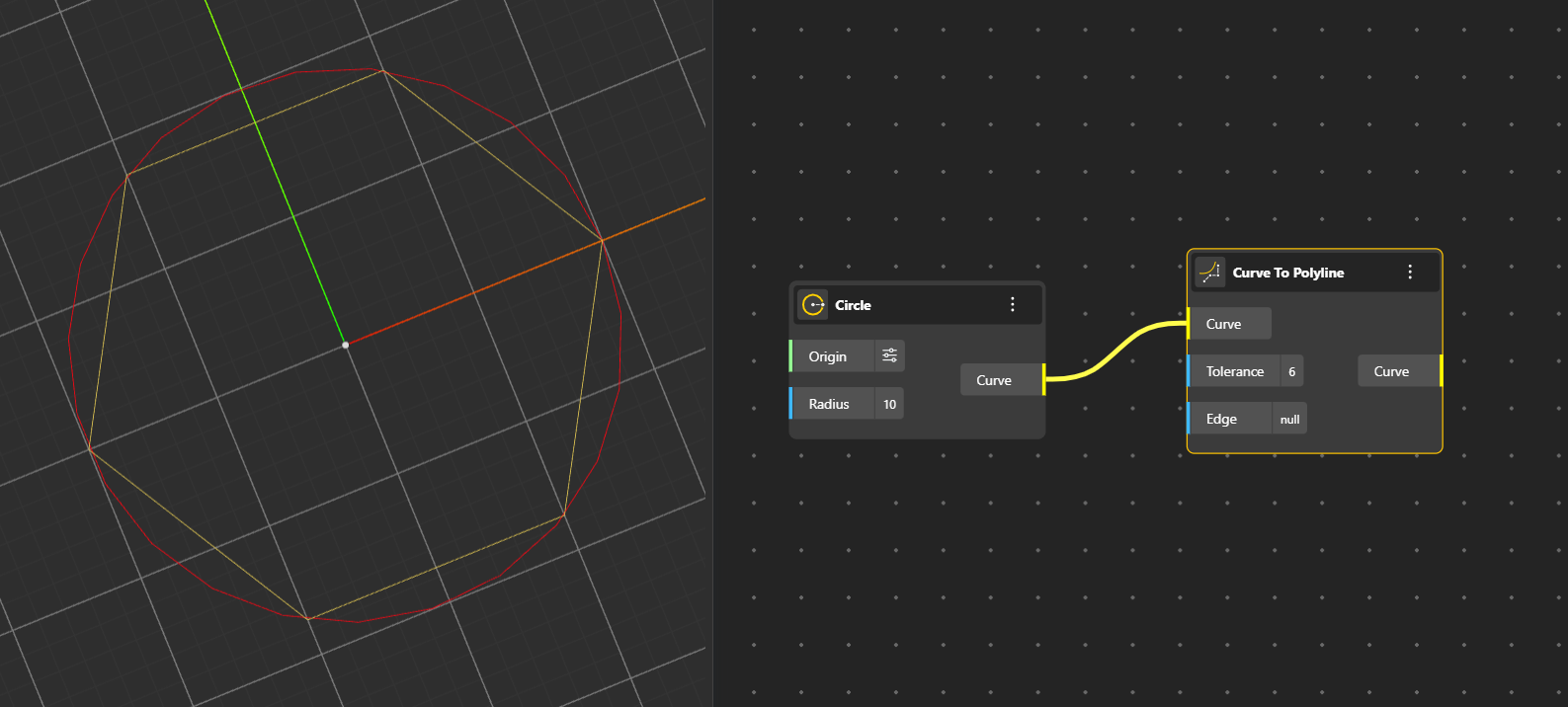 Curve to Polyline: Converts a smooth curve into a series of straight line segments. The output is the polygon as a result of those connected line segments. The input nodes comprise of: