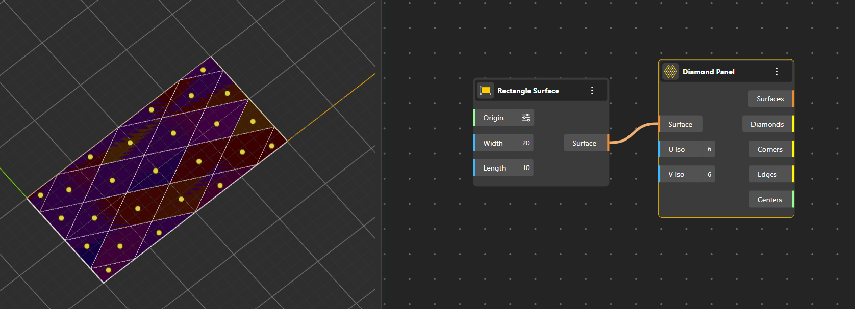 Diamond Panel: Creates a pattern of four-sided diamond-shaped panels. Common in architectural skins, shading systems, and decorative geometric surfaces.