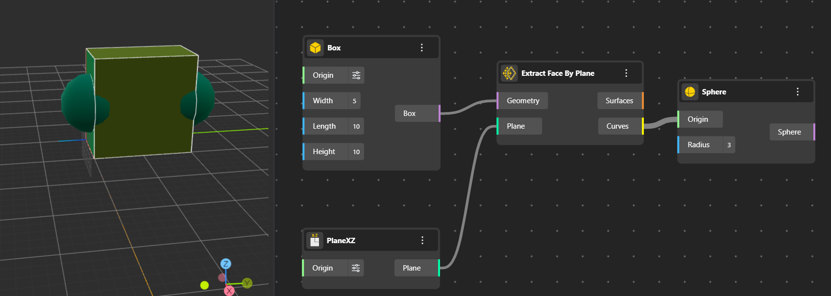 Selects and outputs the face of a solid that is aligned to a given plane. The node pushes your shape outward in the direction of a plane you choose. Anything you connect to its output will sit perfectly on that same plane. Helpful for isolating specific surfaces.