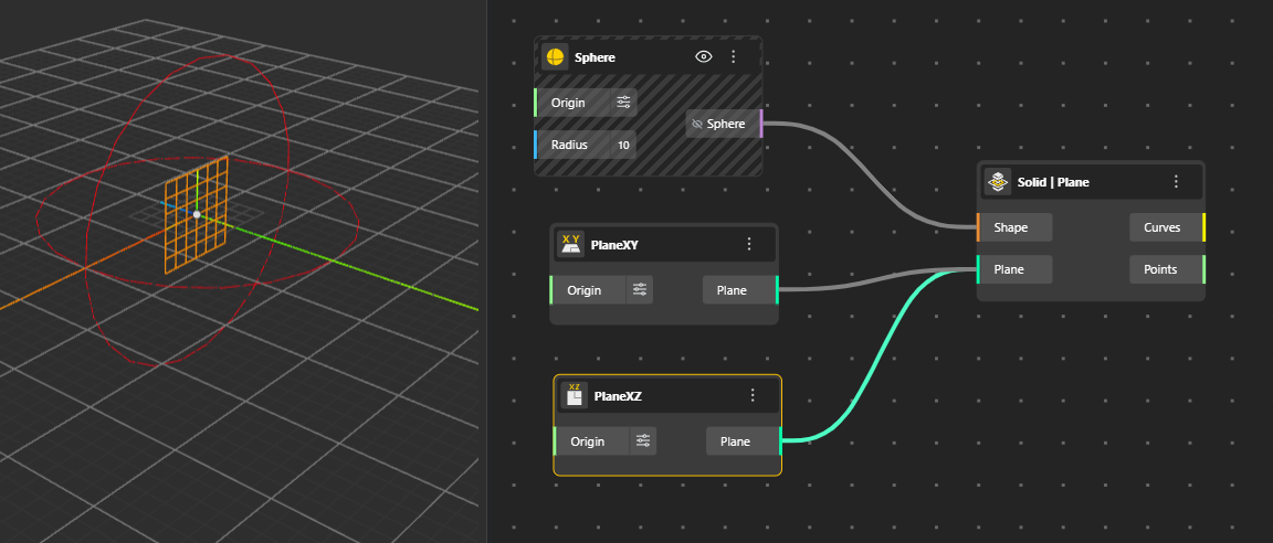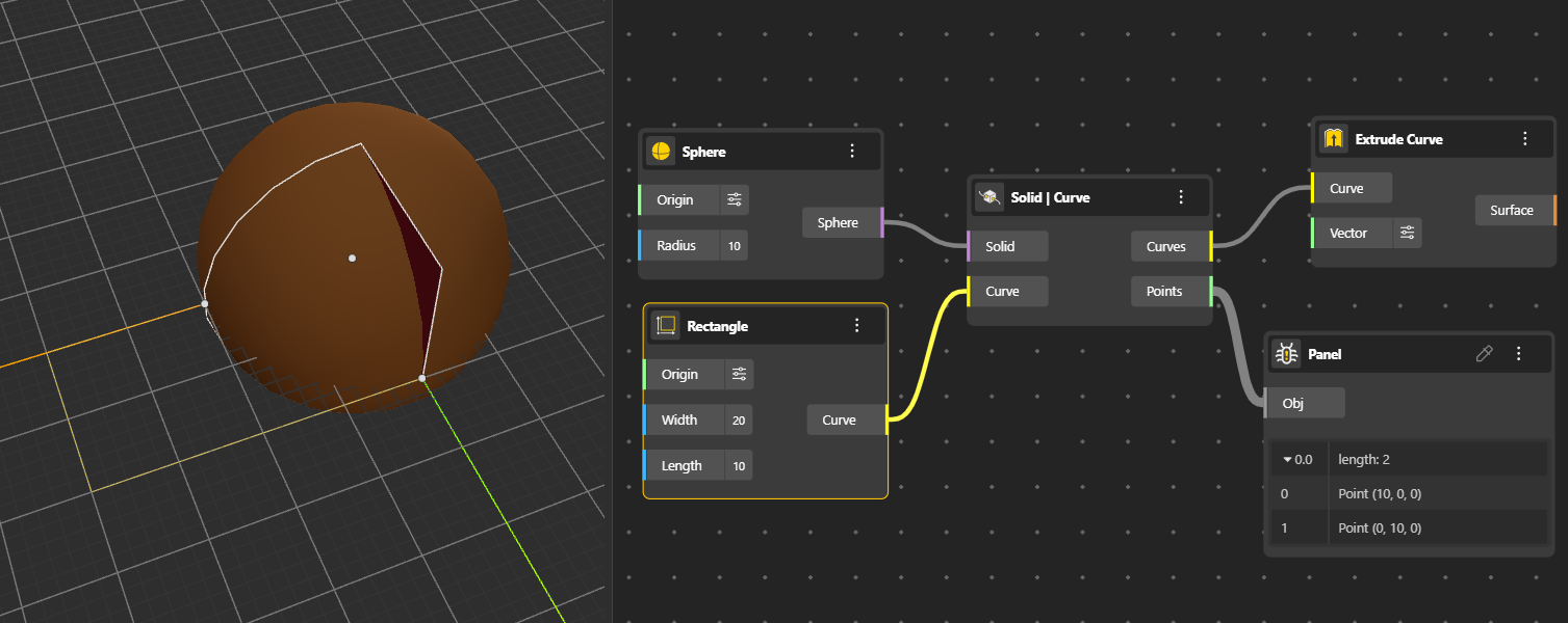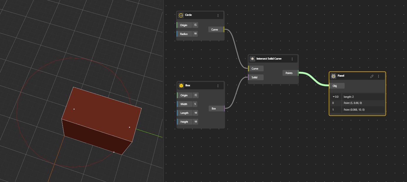 The output provides intersection points and curves on the faces where the solid and curve meet. (Hide the Solid node for better preview.)
