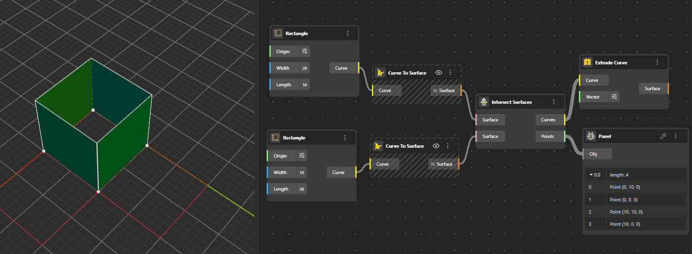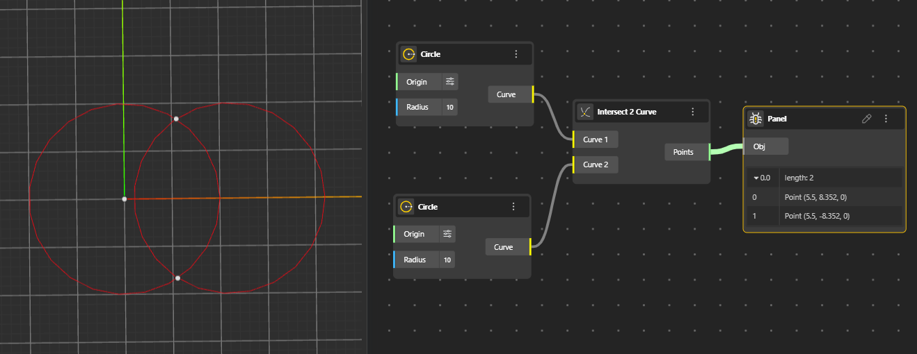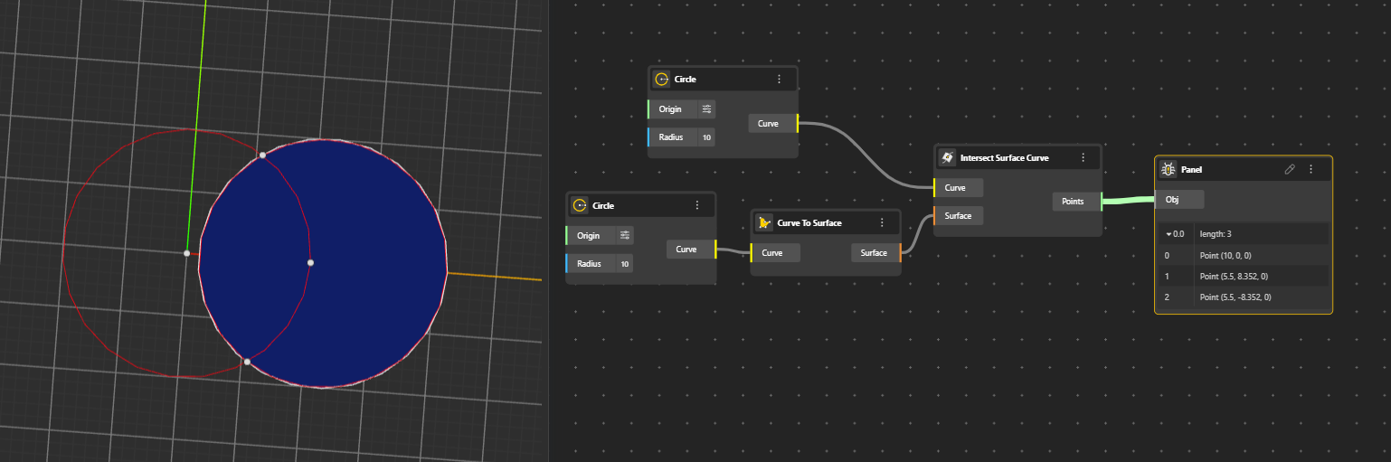 Calculates the intersection curves between two surfaces. The output are the curves that represent the exact lines where the surfaces intersect. (You can Hide the surfaces for better preview)