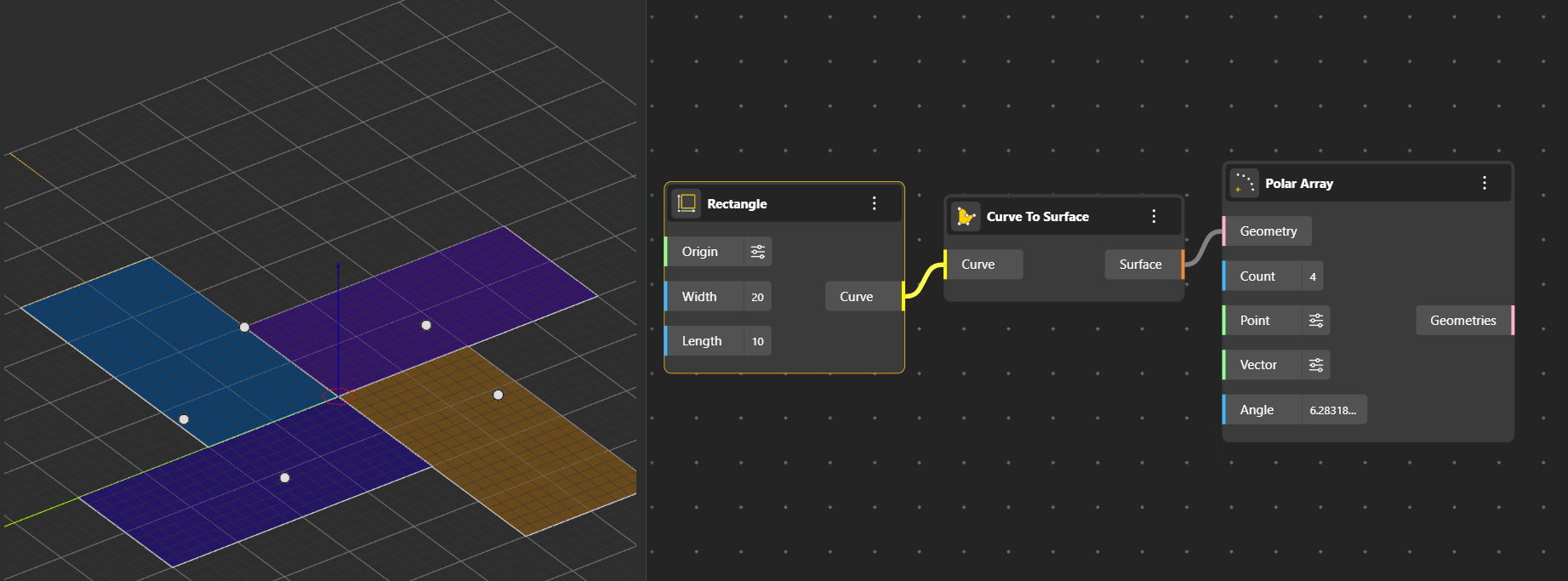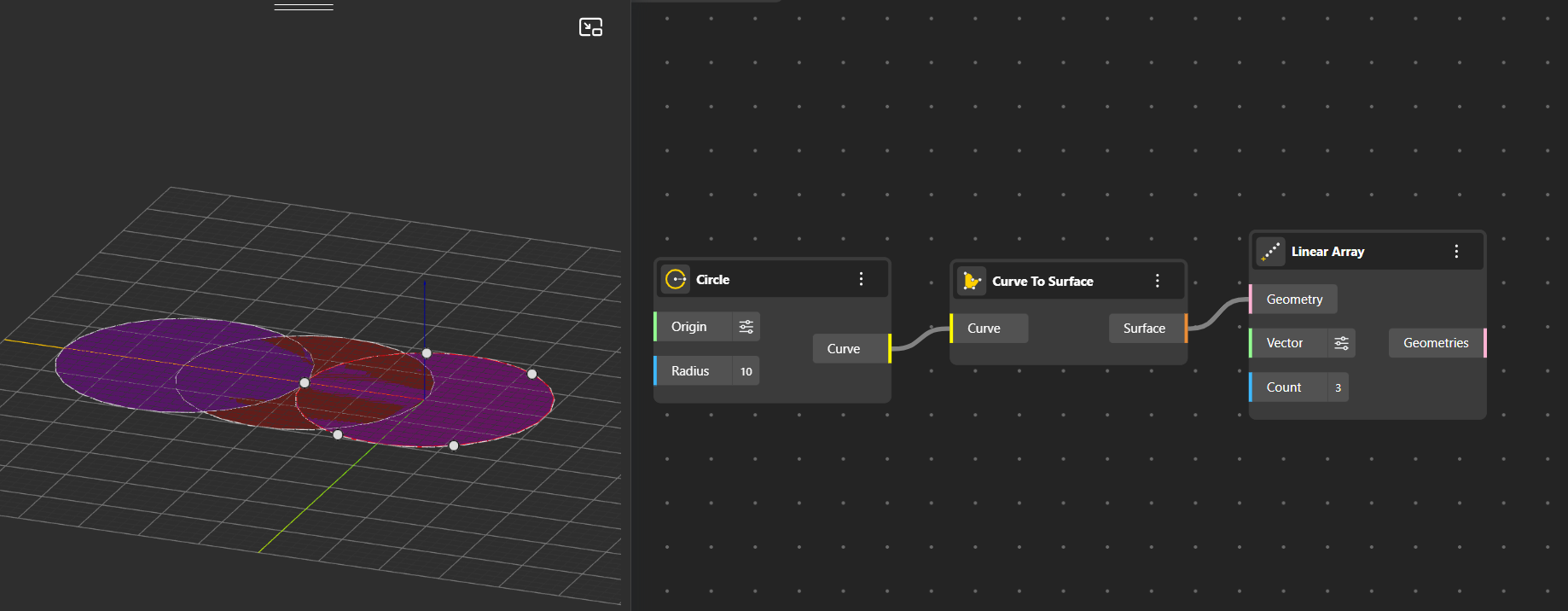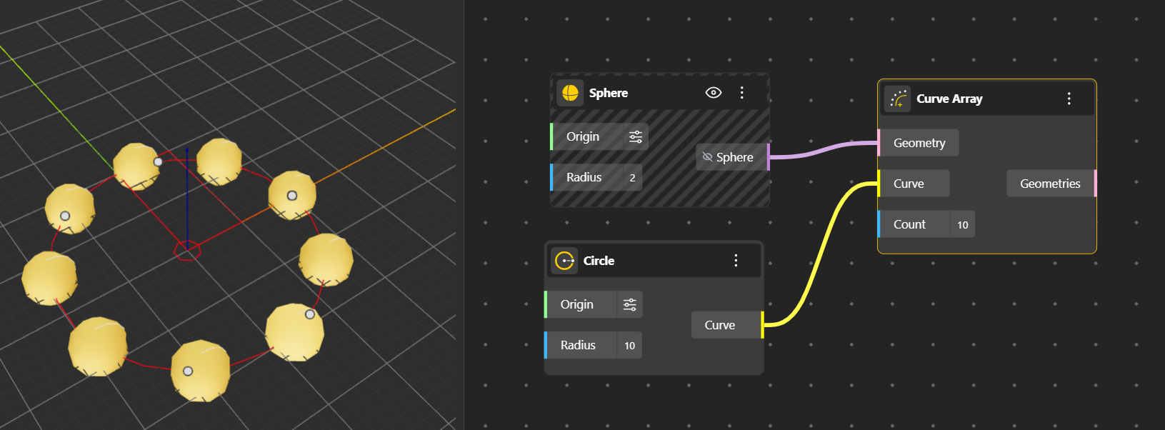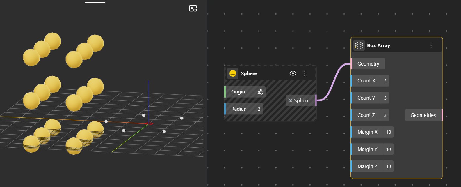 Linear Array: Creates multiple copies of an object in a straight line along a specified direction, with uniform spacing between instances. You can set the direction using the vector input (default is the X-axis) and control how many copies are generated using the count input.