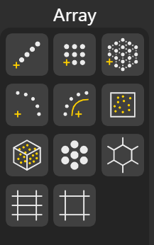 Rectangular Array: Generates copies of an object in a 2D grid pattern (along the X-Y plane). You can change the spacing and count in both directions using the Margin X or Y and Count X or Y respectively.