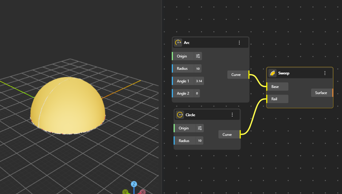 Example: If the base is an arc and the rail is a circle, the arc moves along the circle and makes a hollow, curved shape like part of a sphere.