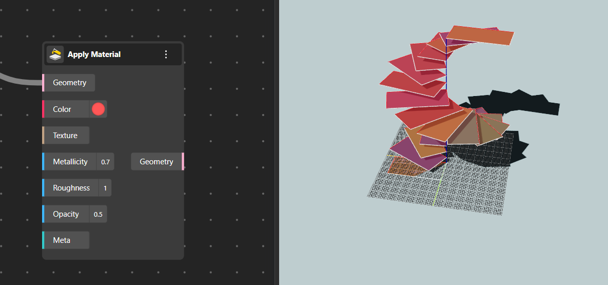 The Apply Material node assigns visual properties to geometry so it appears with color, texture, and physically-based rendering (PBR) attributes in the viewport or final output.