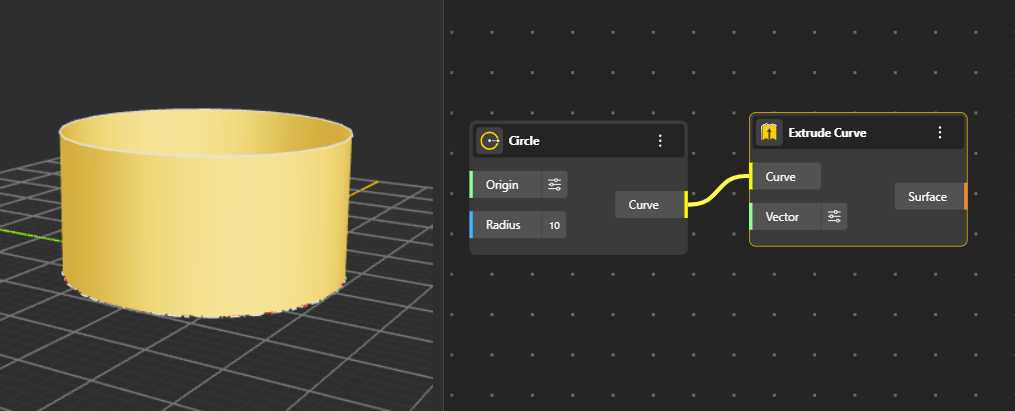 Generates a surface by extruding a curve along a direction or path, producing walls, panels, and linear extensions. You can decide the length and direction of extrusion from Vector port. (By default its In Z direction)